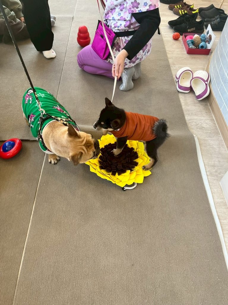 今回パピーパーティーに参加してくれたのはフレンチブルドッグのおせんべえちゃん(5ヶ月)、豆柴のクロミちゃん(3ヶ月)です。