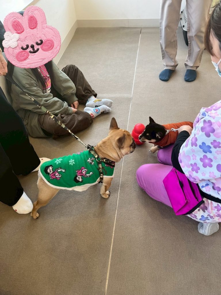 挨拶しようとしましたが、クロミちゃんの方は少し緊張気味なようでした。今後、少しずつ他のワンちゃんに慣れていってくれると嬉しいです。
