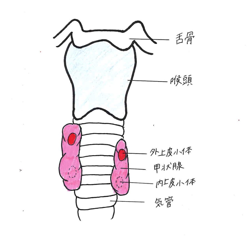 まれに、術後に低カルシウム血症が起き、重度になるとけいれん(テタニー)を起こすことがあるので、注意する必要があります。