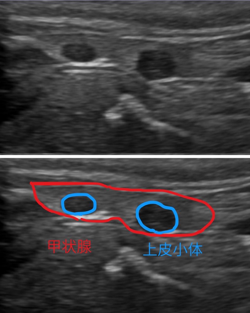 頸部の超音波検査の結果、カルシウムの量を調節している左側の上皮小体という臓器が2か所腫れていることがわかりました。上皮小体は副甲状腺とも呼ばれる臓器で、頸部の甲状腺にくっつくような形で存在しています。ホルモンを出すことでカルシウムの調節をしている臓器です。