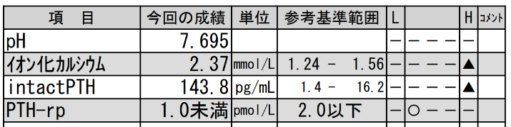 ここが腫瘍化すると、カルシウムの産生を増加させるパラソルモン(PTH)というホルモンが過剰に作られ高カルシウム血症になってしまいます。追加でパラソルモン(PTH)の測定を実施しました。