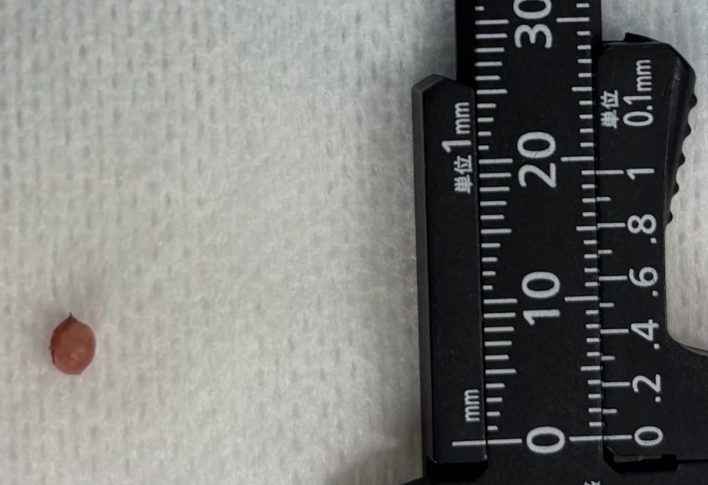 こちらが摘出した腫瘤です。上皮小体は4㎜を超えてくると腫瘍の可能性があると言われています。左側の上皮小体が2つとも腫れていましたので切除しました。